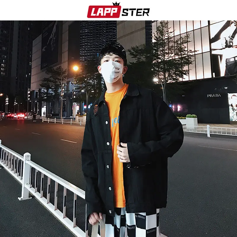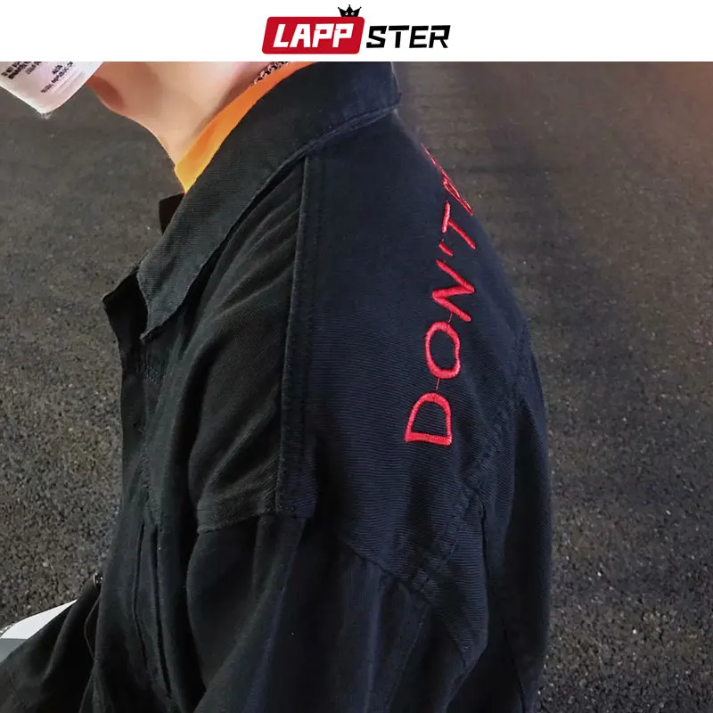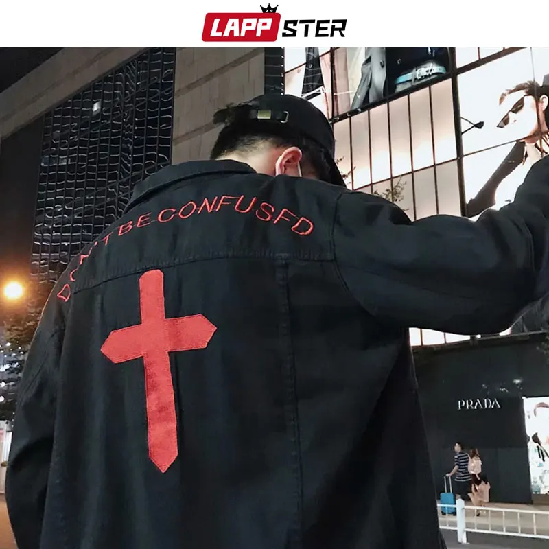 | LAPPSTER Streetwear Cross Jeans Jacket Men 2020 Mens Embroidery Hole Hip Hop Windbreaker Male Fashions denim Bomber Jackets |