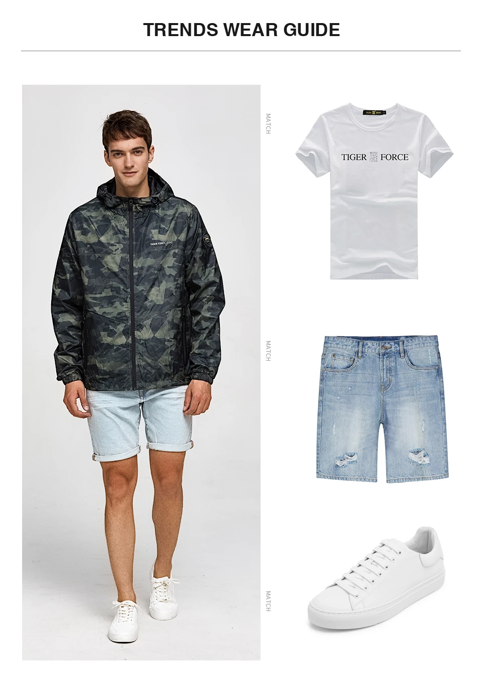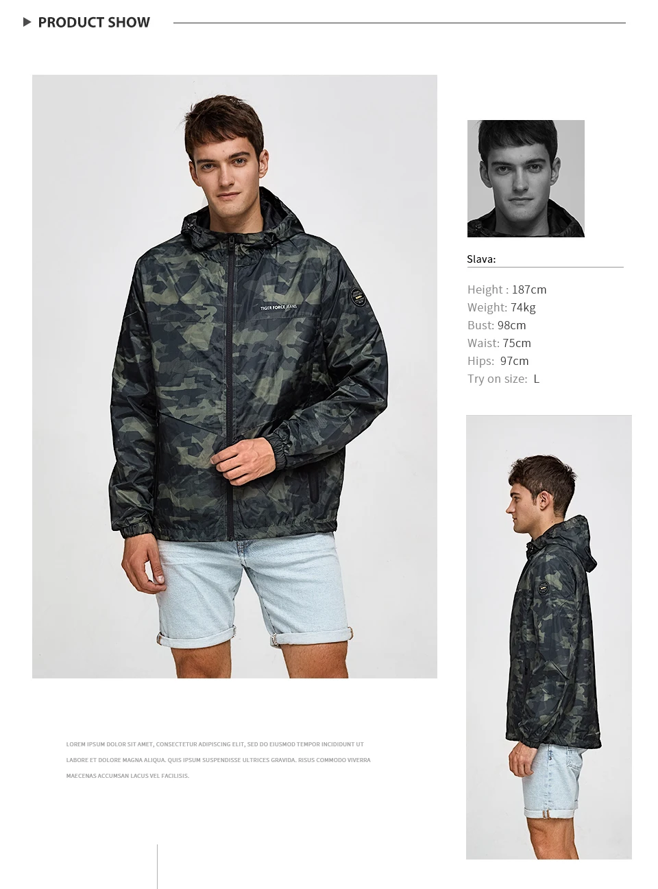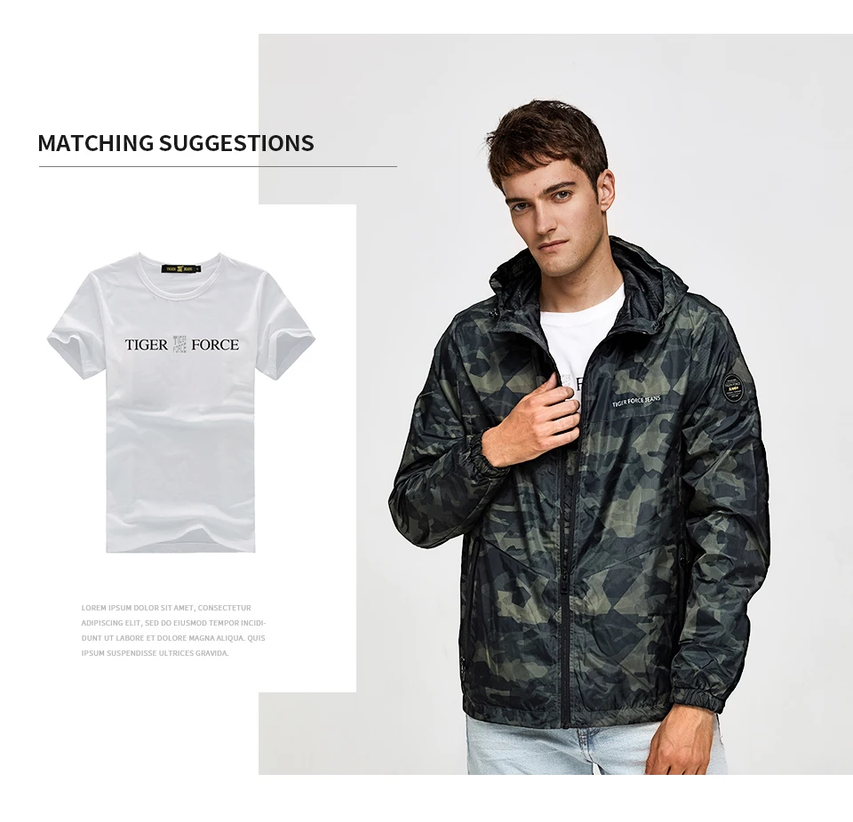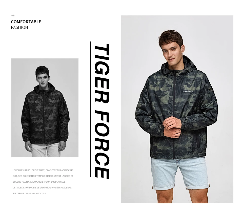 | TIGER FORCE Spring Men Casual Jacket Hooded Camouflage Jacket with Print Men's Windbreaker Coat Male Army Camo Outwear |