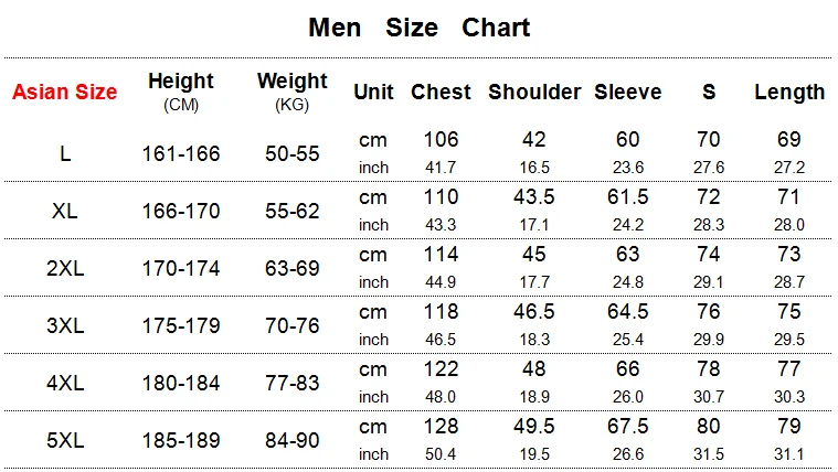1. How to choose size: As like this picture to measure your Jacket's Chest, Shouler, Sleeve. This is Asian size, Please choose right size follow the size chart! Size: Please Allow 1-3cm error due to manual measurement. 2. This Asian Size is smaller than European Size. If you not sure the size, please tell us your height and weight, and your chest size. At last make decided by yourself. 3. Male Height 173cm , Weight 66kg , Wear Size 2XL. 4. Female Height 160cm , Weight 52kg , Wear Size L.