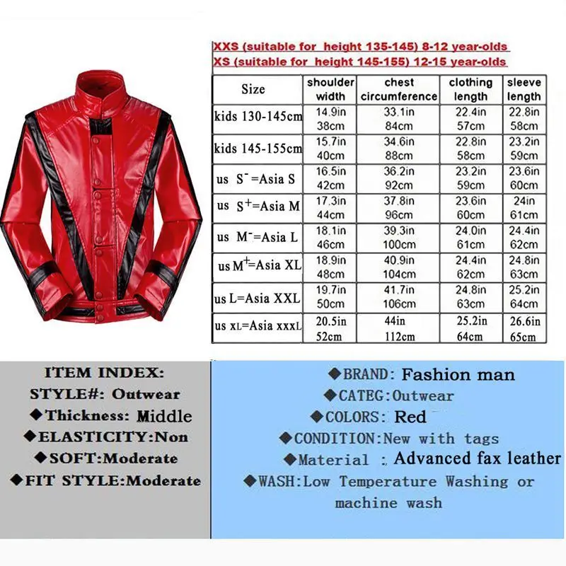 The best product you are looking for is "MJ Michael Jackson Jackets Thriller Jacket Children Kids Coats Costumes Red Patchwork XXS-4XL PU Outwear". This product is available and ready to be purchased. Get attractive discounts every time you shop in our store (aliexpress.com). Aliexpress also provides a coupon of $ 3 for the first buyer to shop there. don't forget to bookmark our store page so you can go shopping again anytime..
