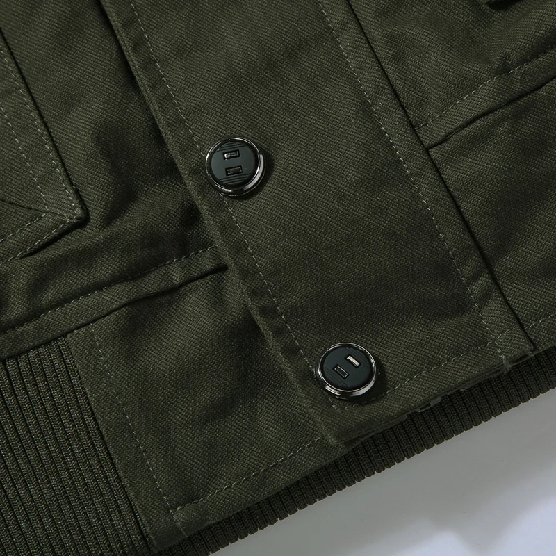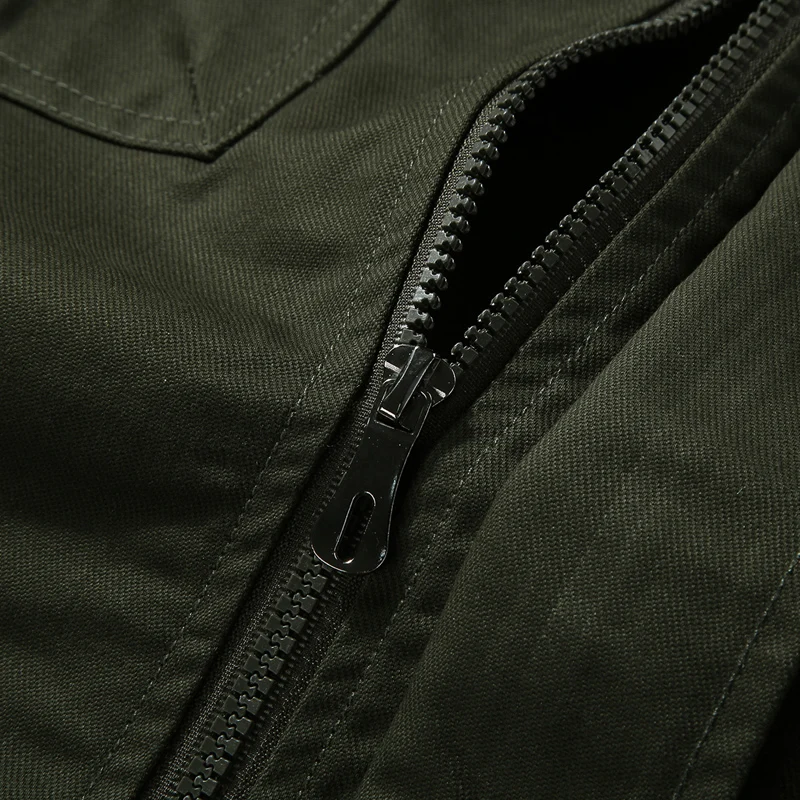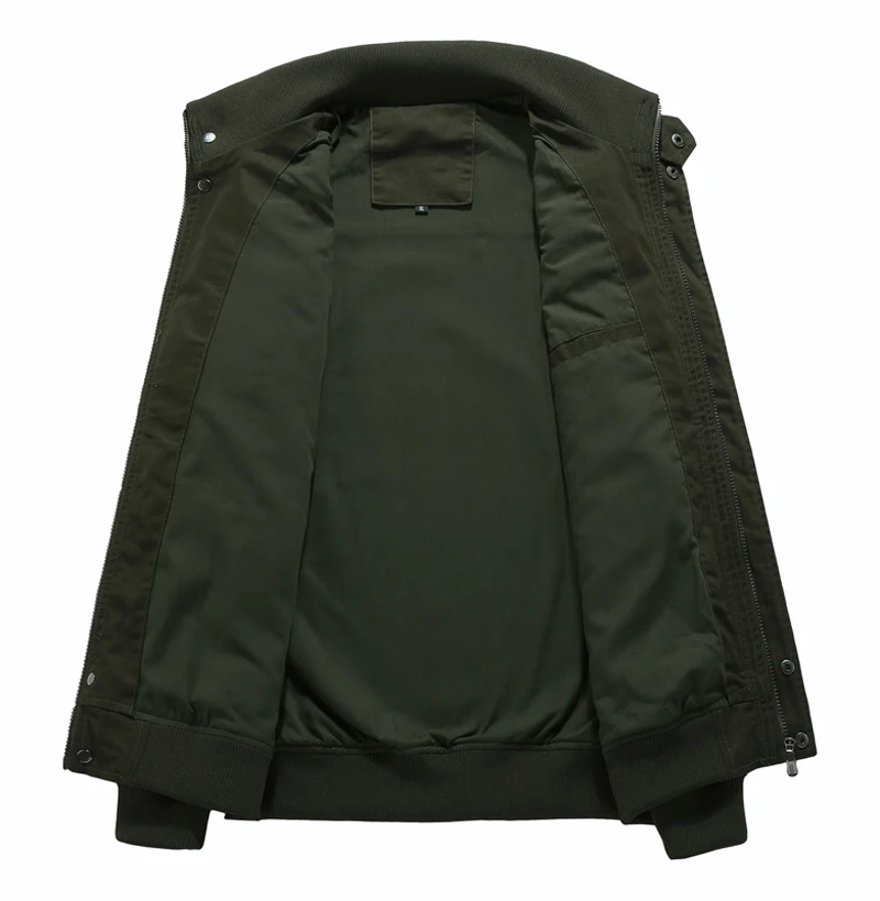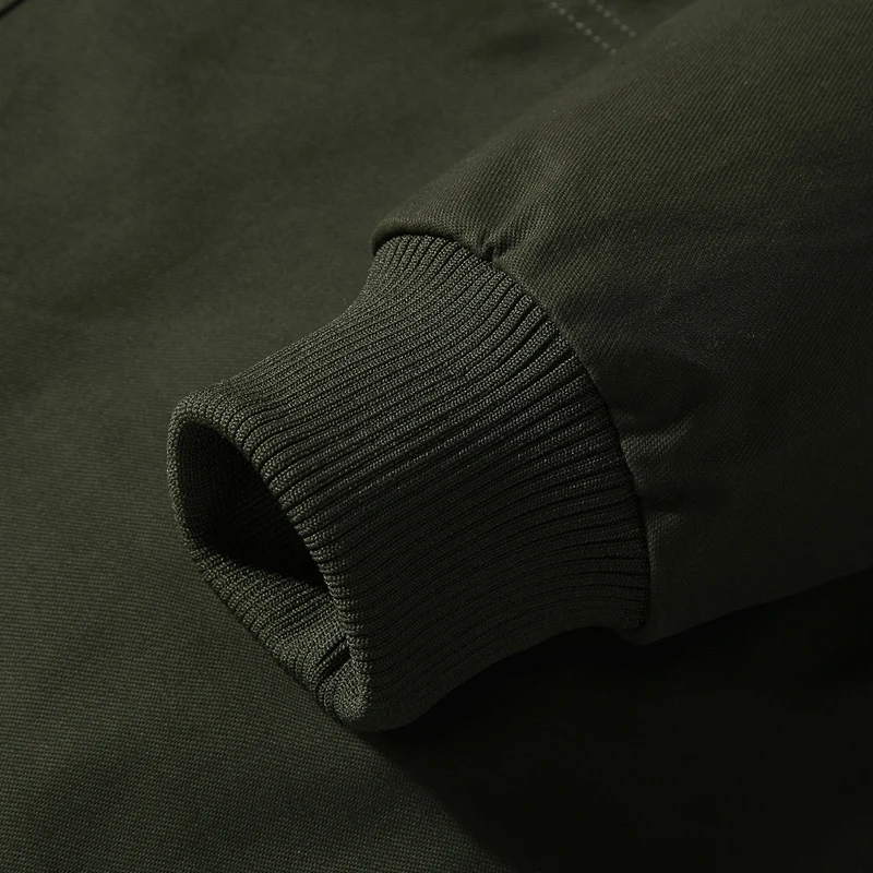 Full length zipper plus snap buttons closure. Stand collar with rib; Knitted rib cuff and hem; Military style for spring, summer, autumn and beginning of the winter