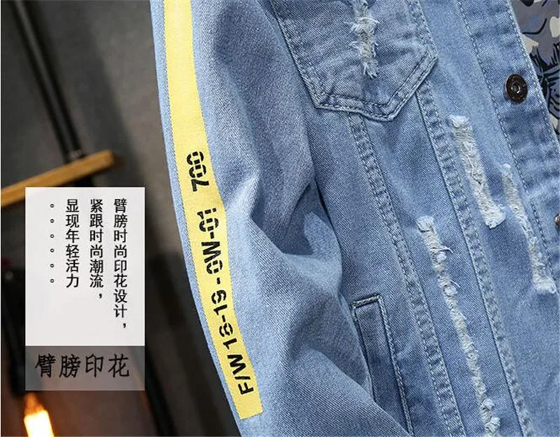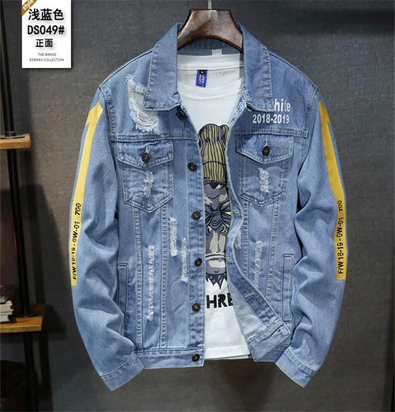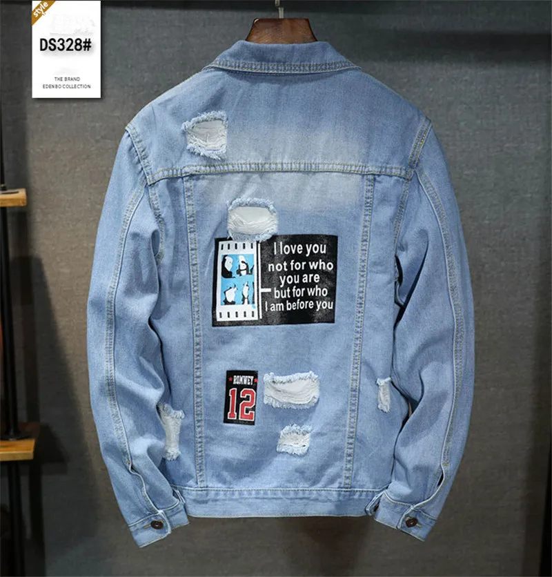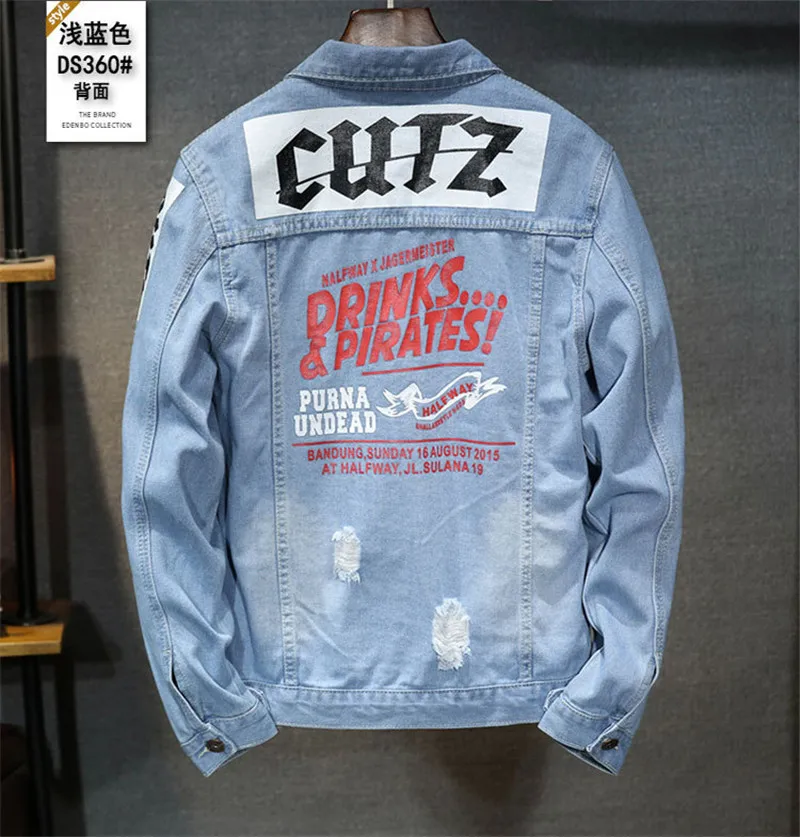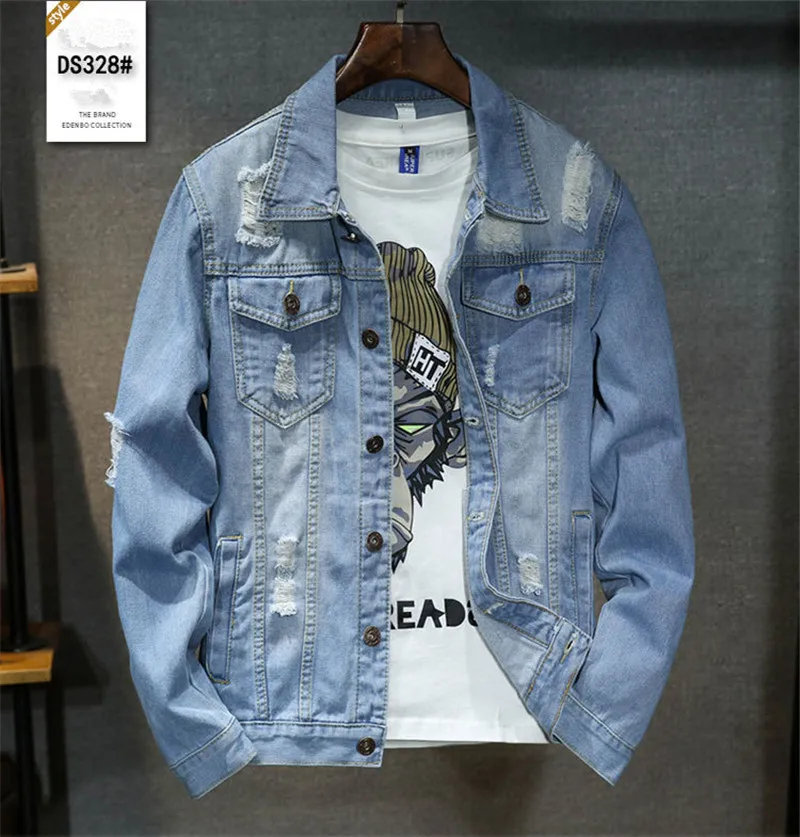 Best Price Comparison With High quality Bomber Denim Jacket Men'S Ripped Holes Lt Blue Jean Jackets New 2020 Autumn/Spring Garment Washed Mens Denim Coat