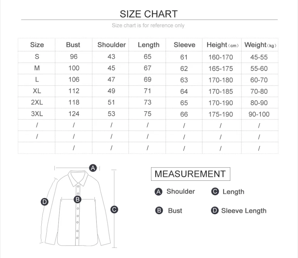 Buyer friends! Hello there! Please refer to the size chart below before purchasing. Our clothing size is smaller in Asia than in the US and EU, for example: US/EU size L = Asian size XXL. If you don't know how to use your own SIZE, please tell me your height and weight. You will get a response within 24 hours. We will choose the right size for you.