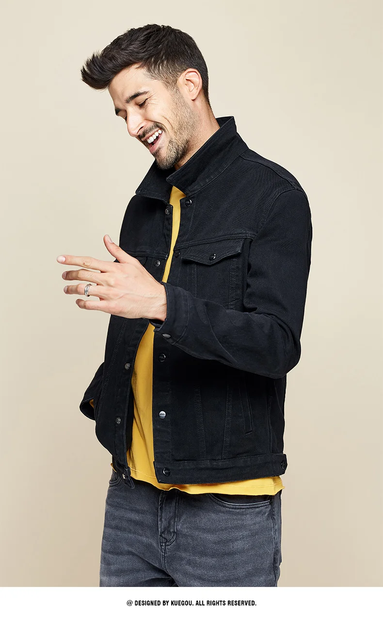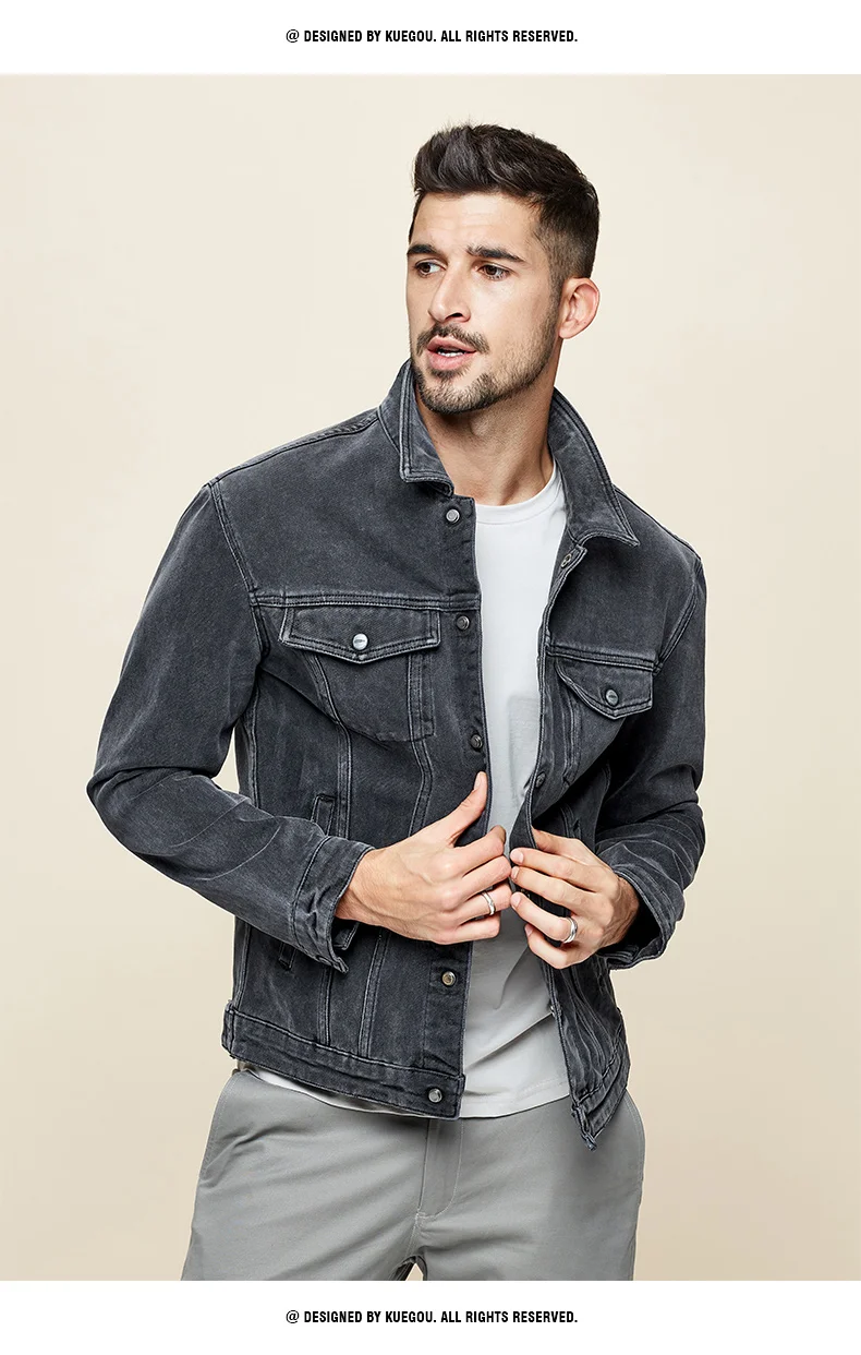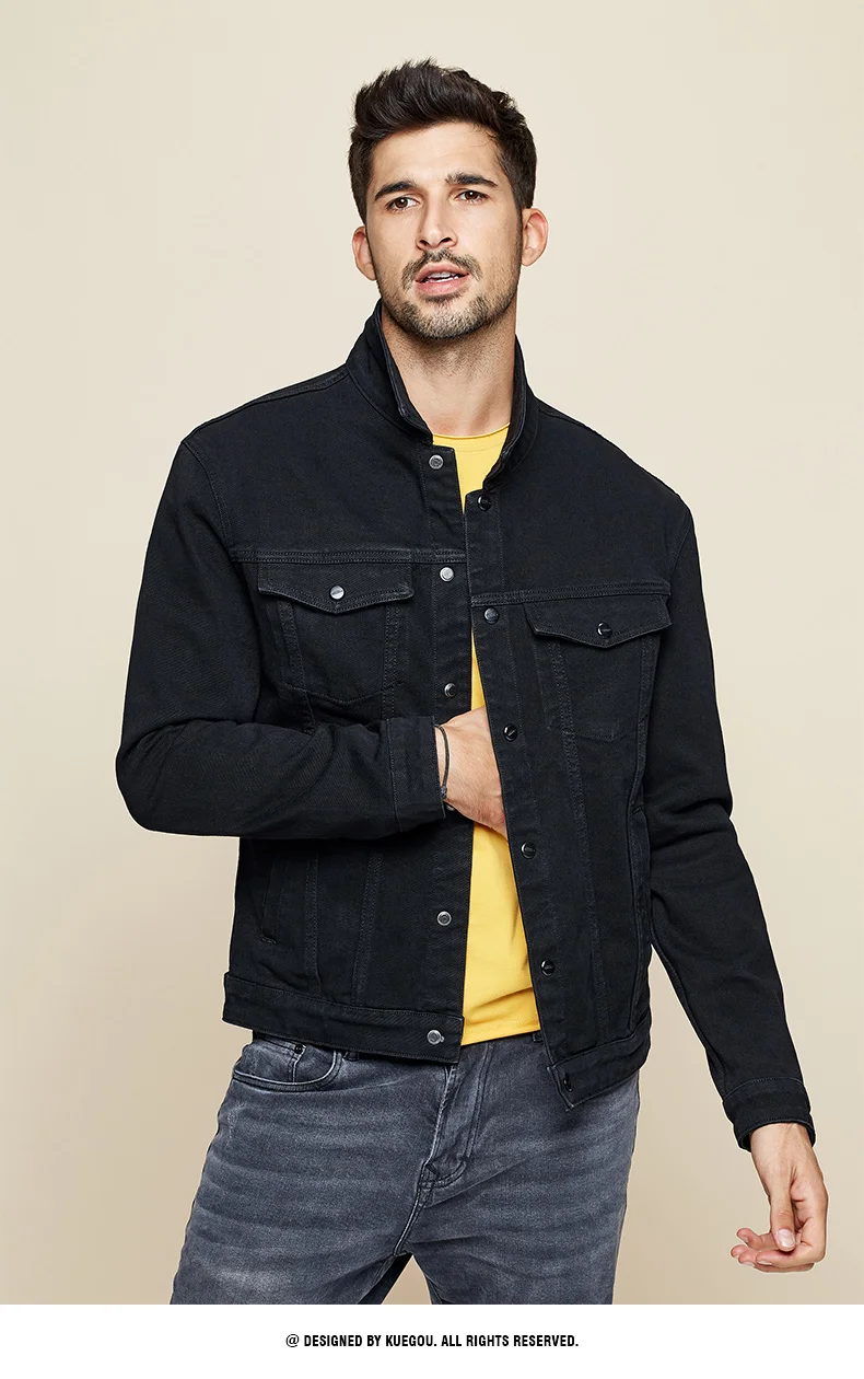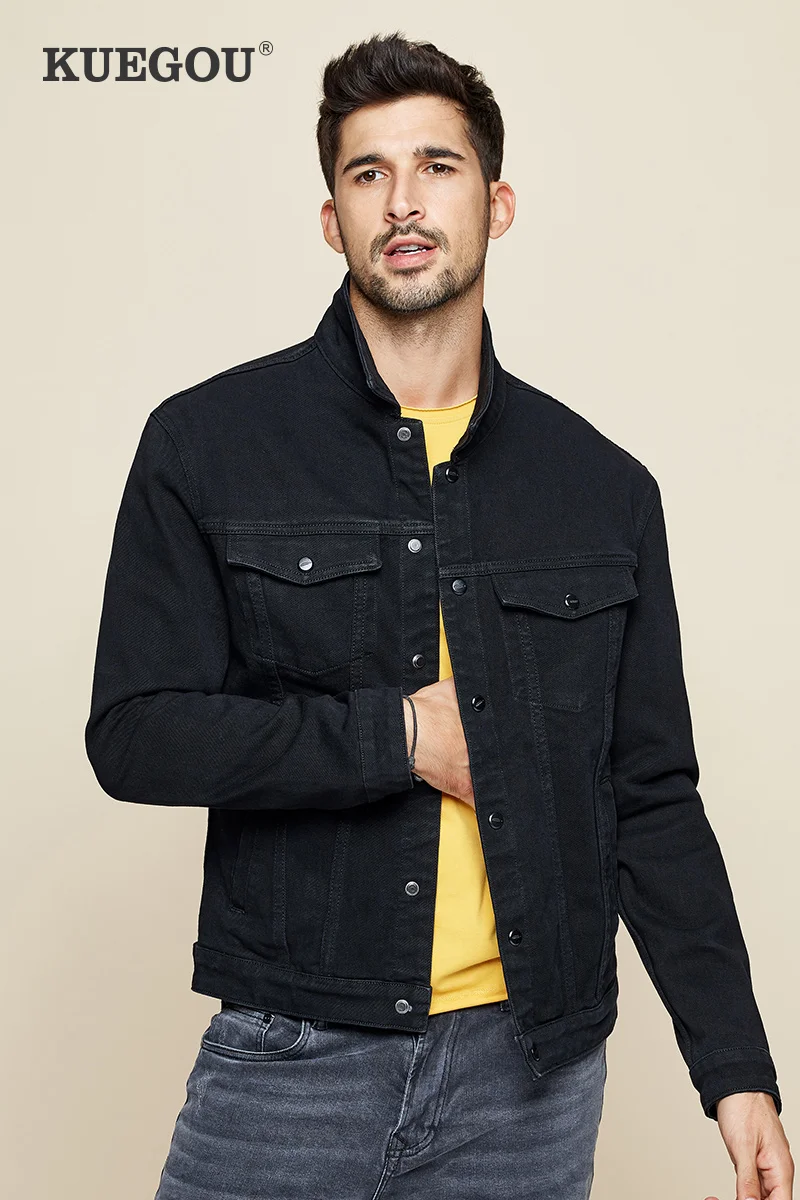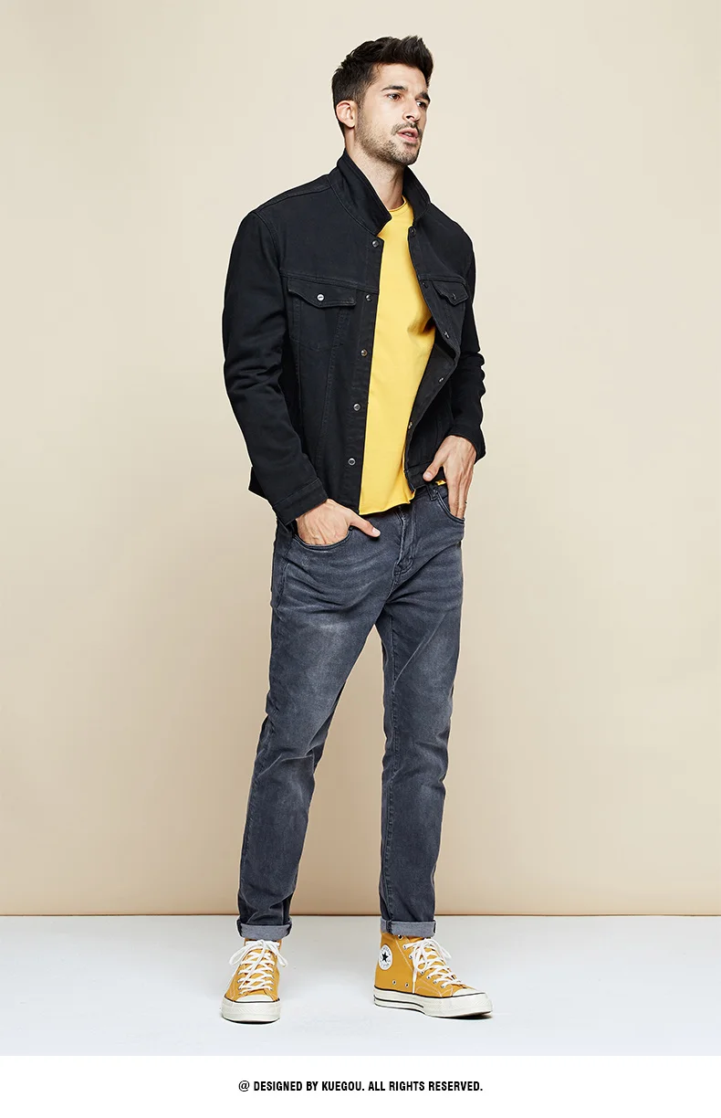 KUEGOU Men's denim jacket South Korean style fashion spring coat Black grey slim cowboy coat lapels top size KW-2988