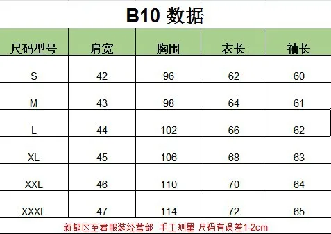 M:Bust 98cm,Shoulder 42cm,Sleeve 60cm,Length 62cm