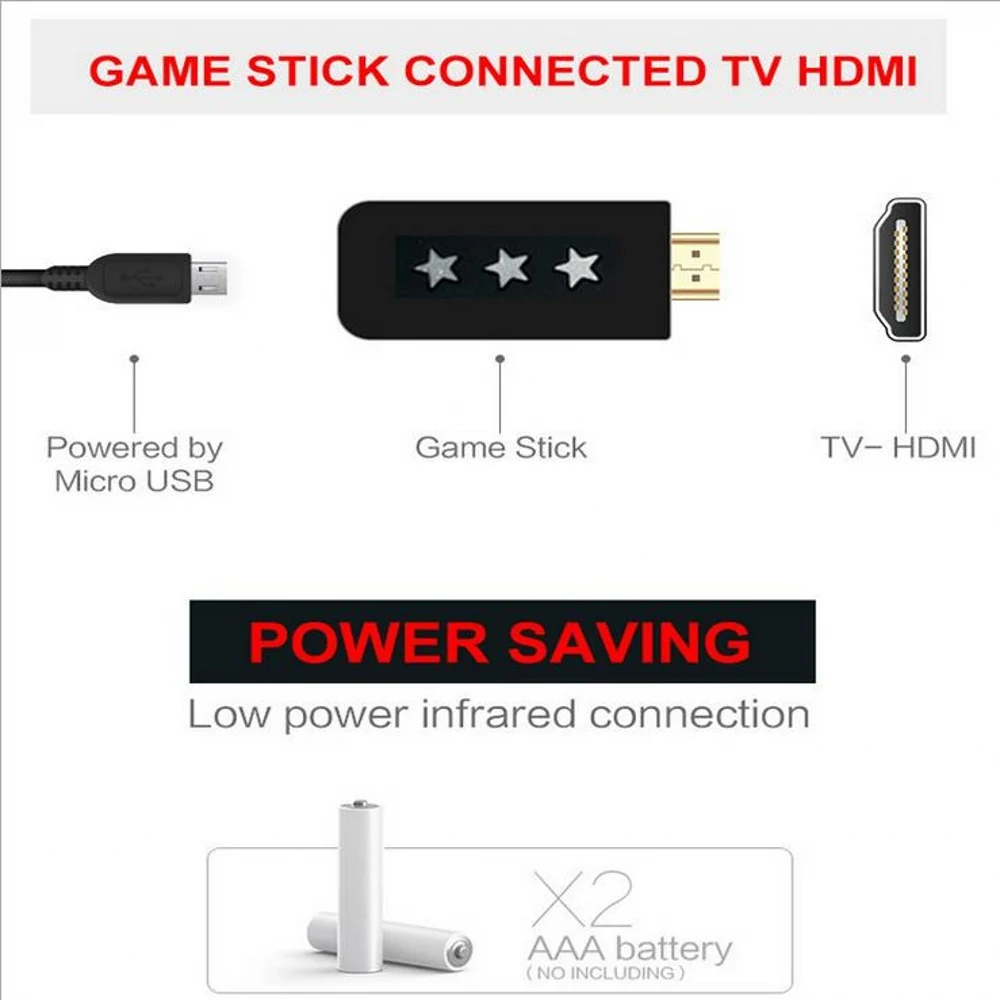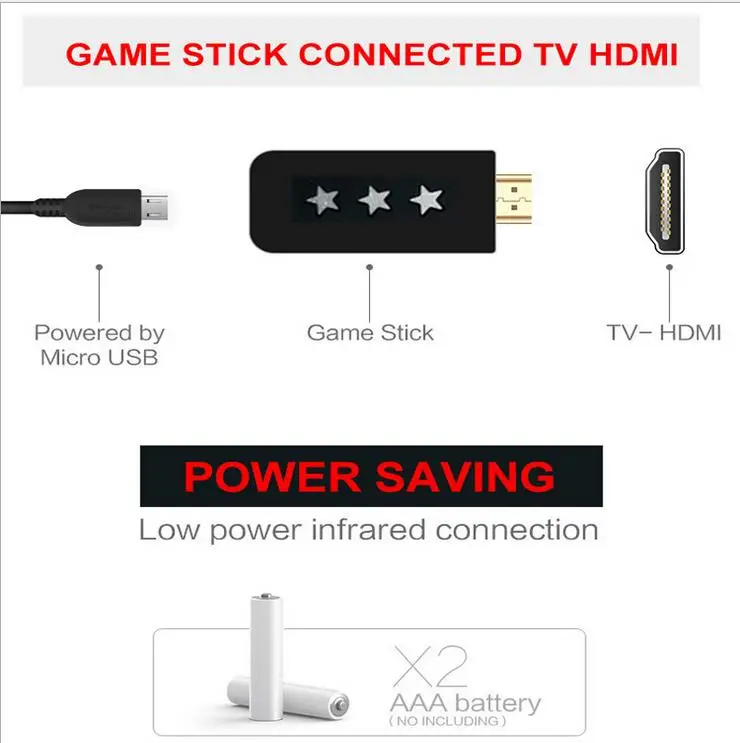 4. Just connect the game console to the HD interface of the TV, connect the USB power supply data line to the host, adjust the TV signal source to the HD channel to display the game list picture on the TV, put the handle into the battery to remote control, plug and play, simple and easy to operate.
